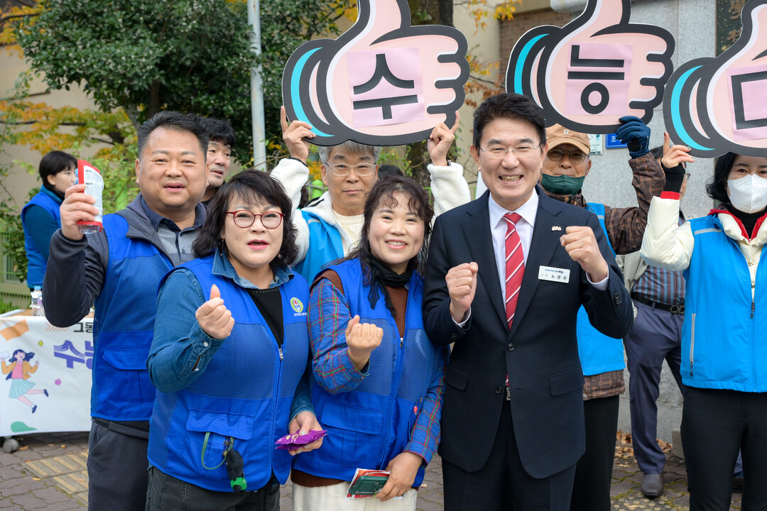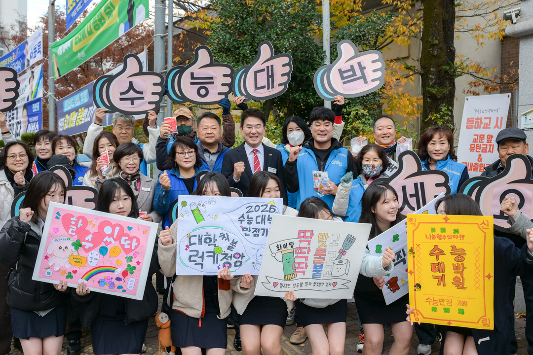 | ▲ 노관규 전남 순천시장이 강남여자고등학교 앞에서 2025 대학수학능력시험 수험생에게 자신감을 갖고 최선을 다하라며 응원을 보낸 뒤 함께 응원에 나선 바르게살기운동협의회원과 기념촬영을 하고 있다. [순천시 제공] |