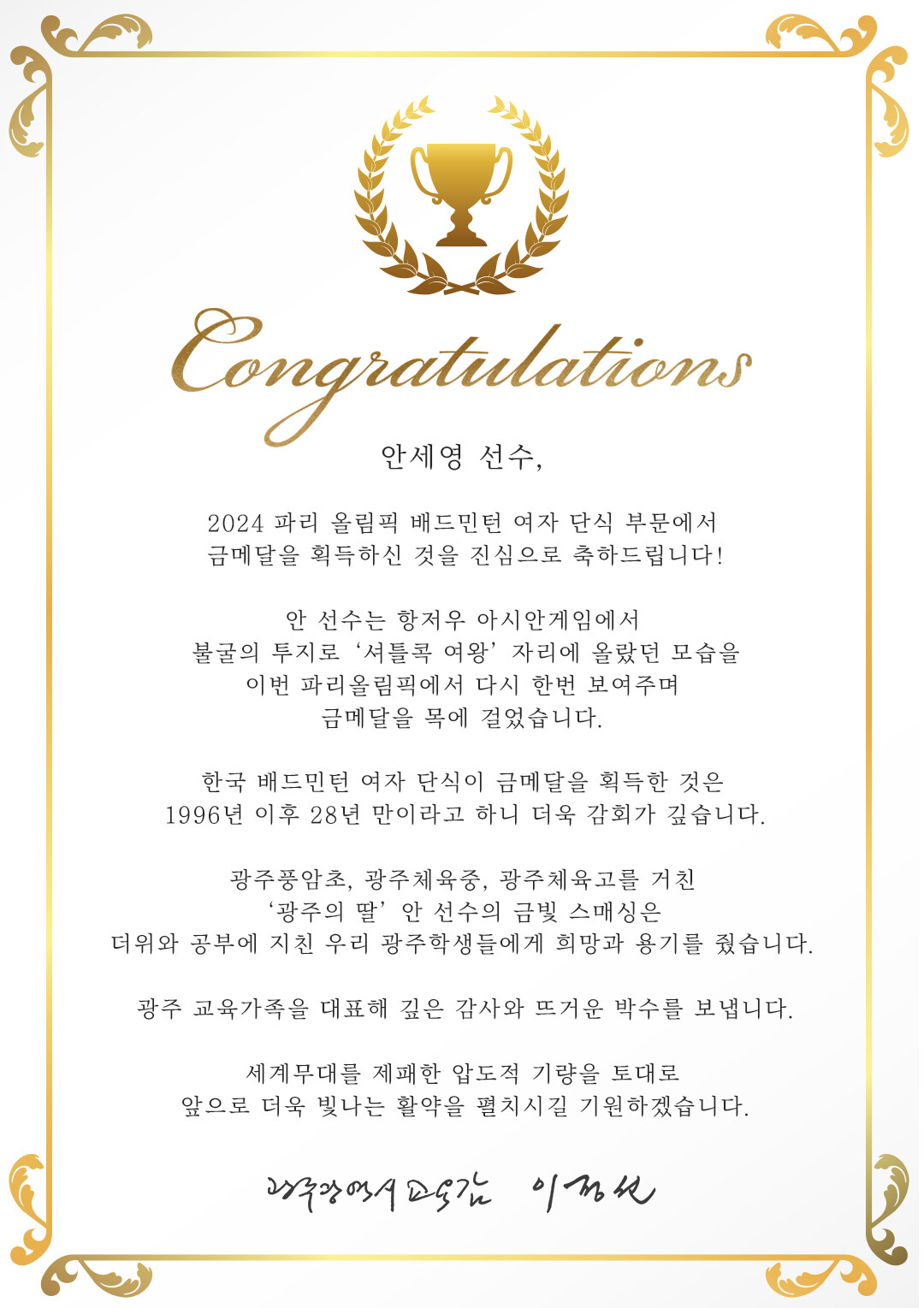 이정선 광주광역시교육감이 2024 파리 올림픽 배드민턴 여자 단식 부문에서 금메달을 획득한 안세영 선수에게 축하를 전했다.