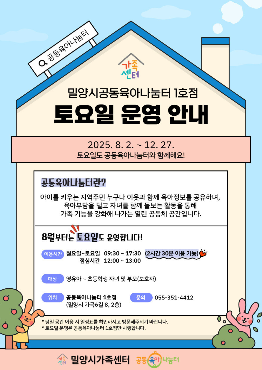 밀양시는 맞벌이 가정 등 평일 이용이 어려운 시민들의 수요를 반영해 공동육아나눔터의 주말 운영을 8월부터 확대한다.