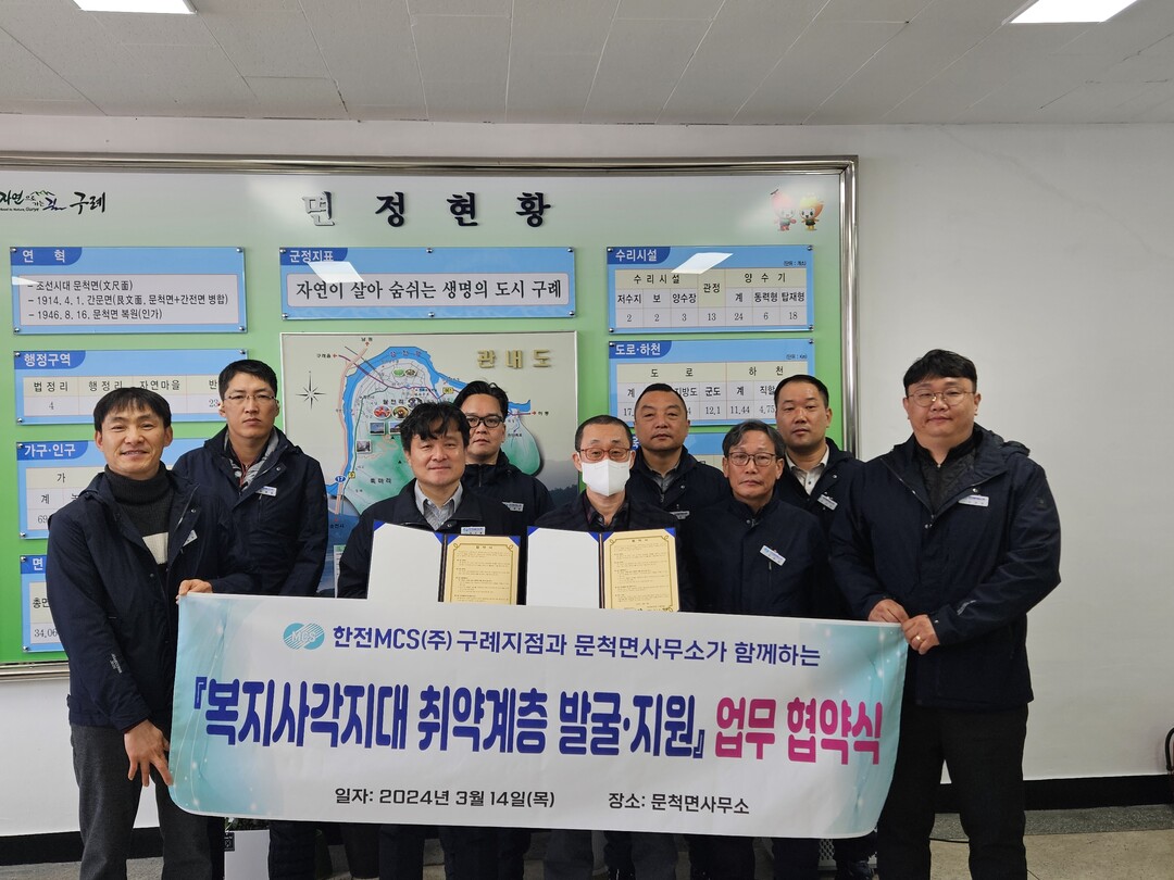 전남 구례군 문척면이 한전MCS(주) 구례지점과 복지 사각지대 위기가구 발굴 지원을 위한 업무 협약식을 가졌다고 14일 밝혔다.