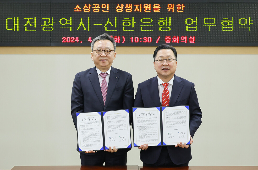 대전시와 신한은행은 9일 대전시청에서 이장우 시장과 정상혁 신한은행장이 참석한 가운데 신한은행 '땡겨요'배달앱을 활용한 '소상공인 상생지원 업무협약'을 체결했다.