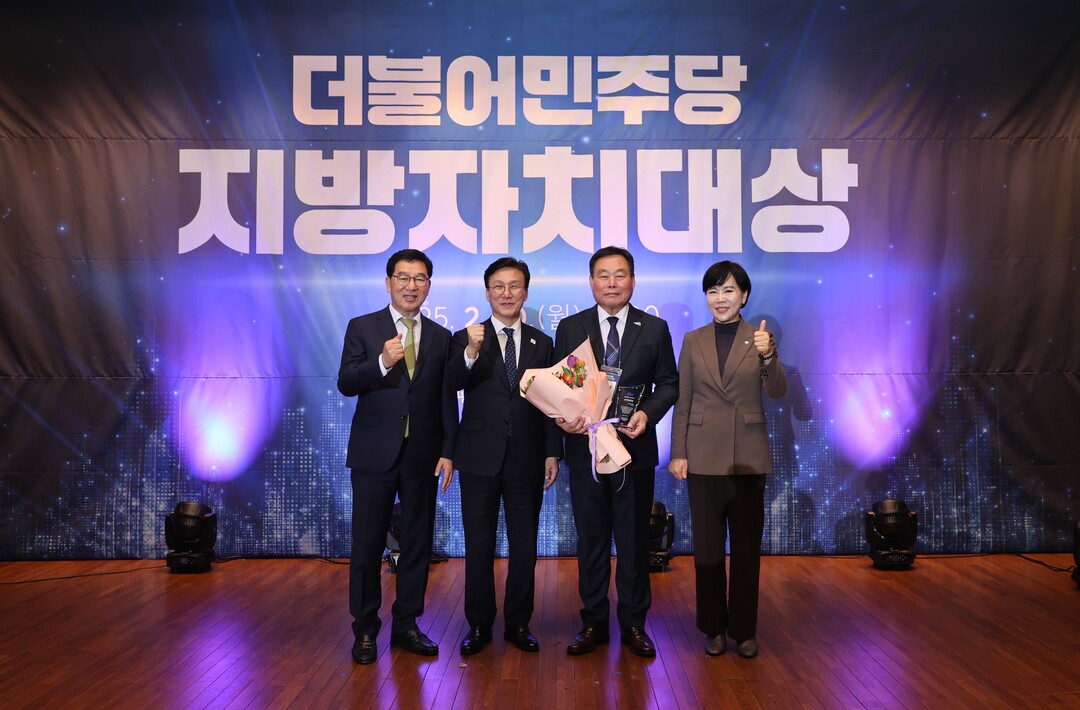 | ▲ 김산 전남 무안군수가 지난 10일 국회도서관에서 열린 '더불어민주당 지방자치대상' 시상식에서 지역경제 활성화 부문 '창의정책상'을 수상한 뒤 기념 촬영을 하고 있다. [더불어민주당 제공] |