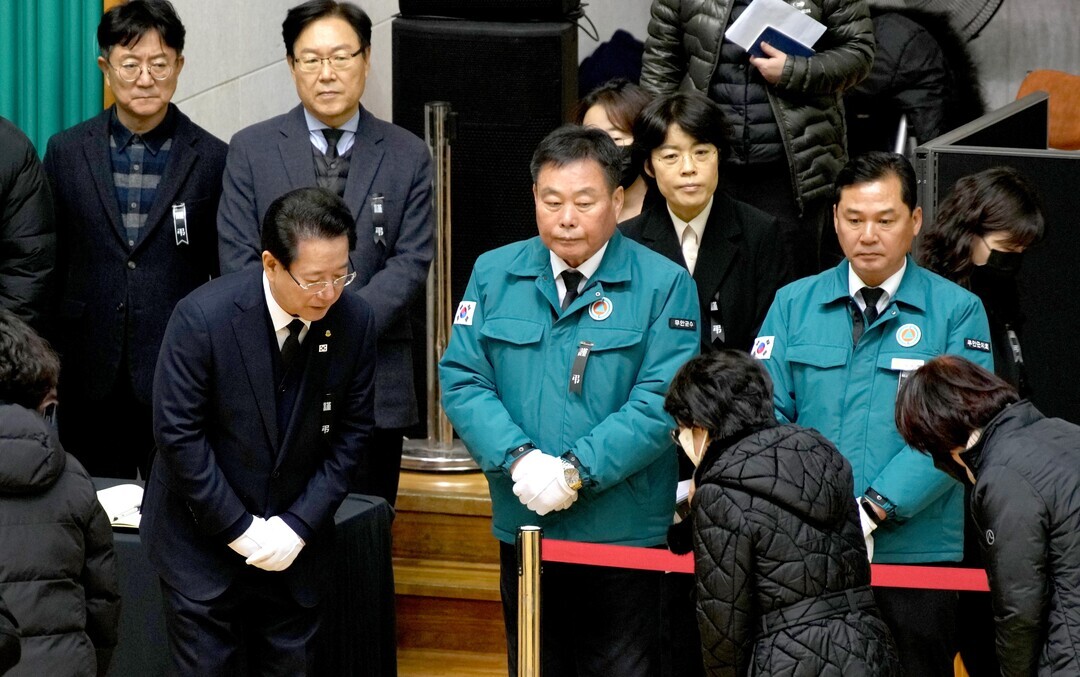 | ▲ 지난해 12월31일 김영록 전남지사와 김산 무안군수, 이호성 무안군의회 의장이 무안스포츠파크에 마련된 제주항공 여객기 추락사고 희생자 합동분향소에서 희생자를 애도하기 위해 찾아온 조문객을 맞이하고 있다. [전남도 제공] |