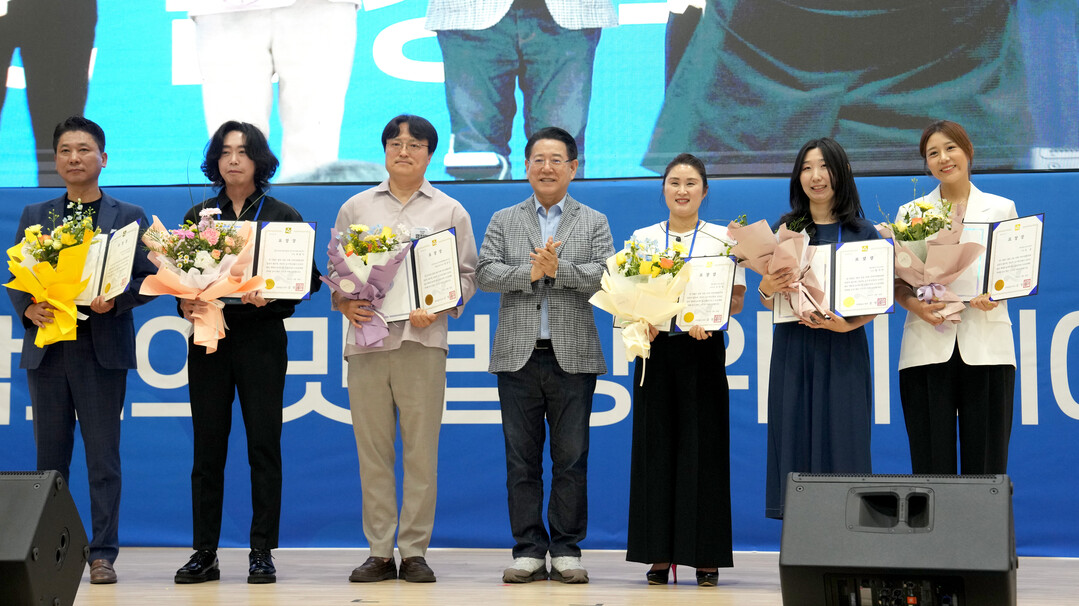 | ▲ 김영록 전라남도지사가 28일 순천만생태문화교육원에서 열린 '2025 남도장터 로컬 우수상품 품평회' 행사에서 유공자들에게 감사패와 표창을 수여하고 기념촬영을 하고 있다. [전남도 제공] |