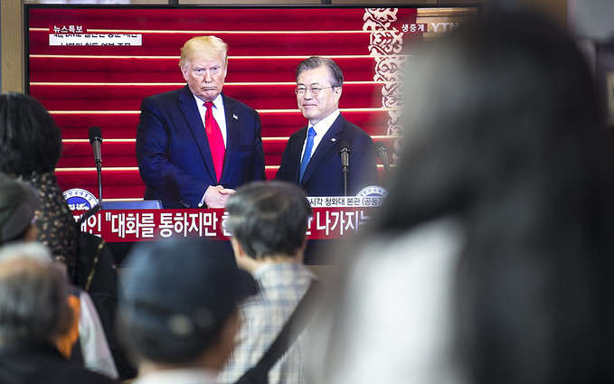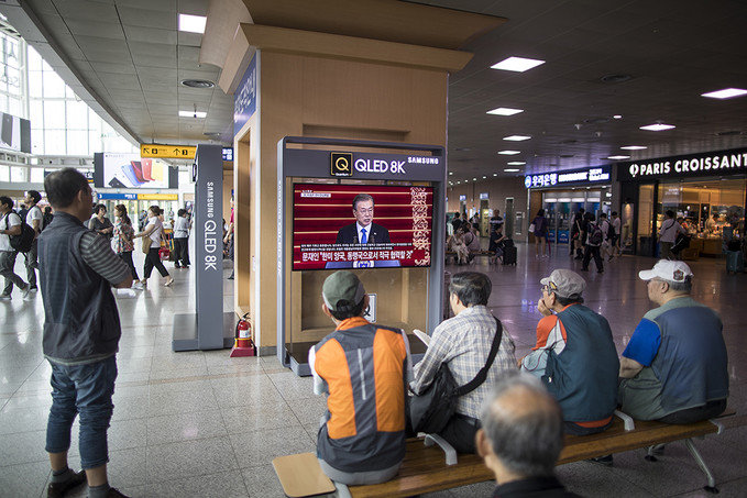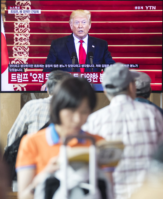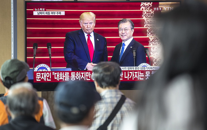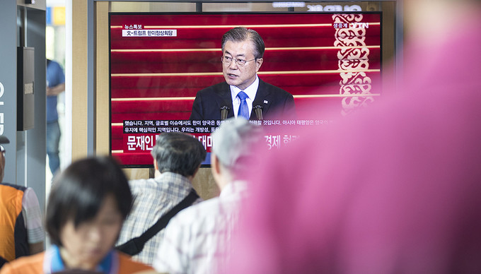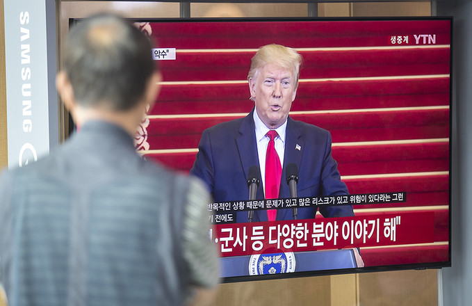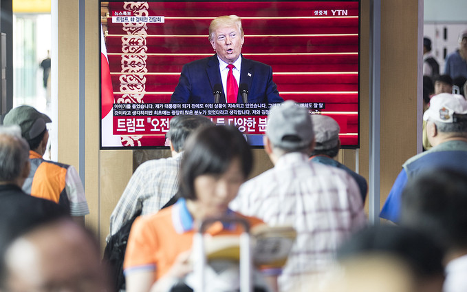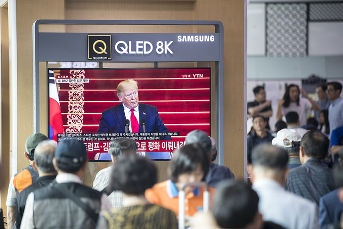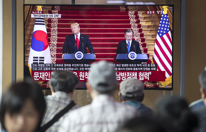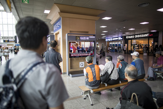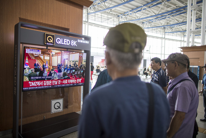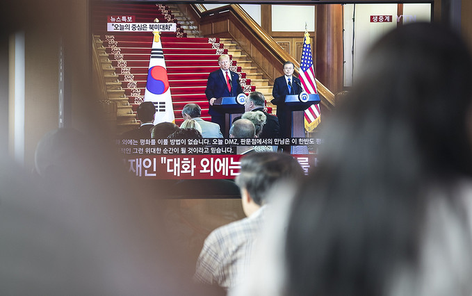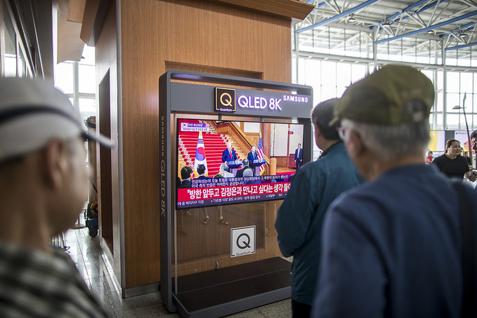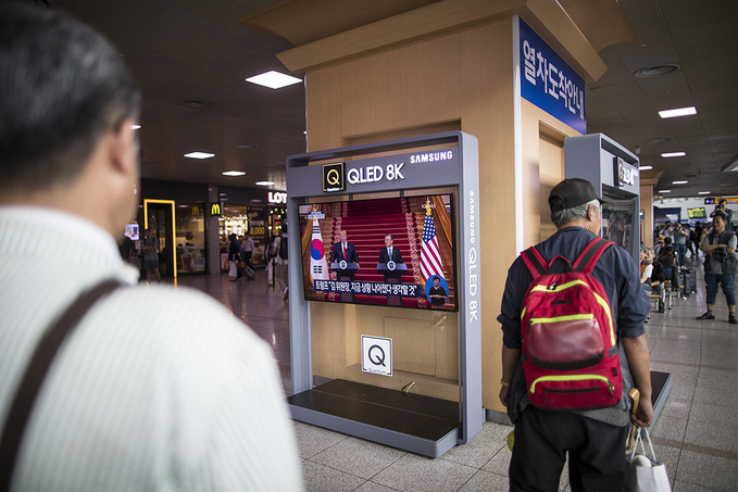 30일 오전 서울 용산구 서울역 대합실에서 시민들이 한·미 정상 공동기자회견 중계방송을 지켜보고 있다. 문 대통령은 이날 기자회견 모두발언에서 "(6ㆍ25전쟁) 정전선언 이후 66년 만에 판문점에서 미국과 북한이 만난다"고 밝혔다.