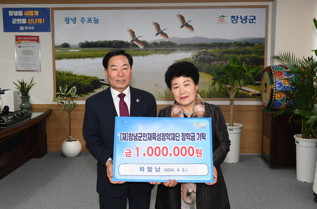 지난 3일 창녕읍에 거주하는 하말남 씨가 창녕시니어클럽 한올봉제 사업단에서 일하면서 차곡차곡 모은 100만 원을 장학금으로 써달라고 기탁했다. 지난달 22일엔 익명을 요구한 독지가가 장학금 100만 원을 기탁하는 등 올해 기탁금 총액이 6600만 원에 이른다.
