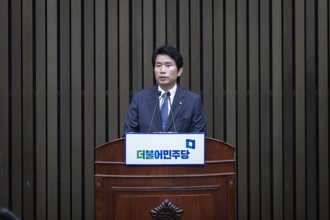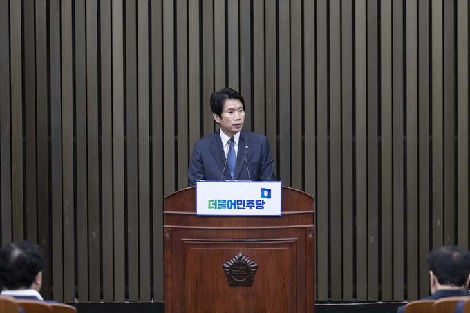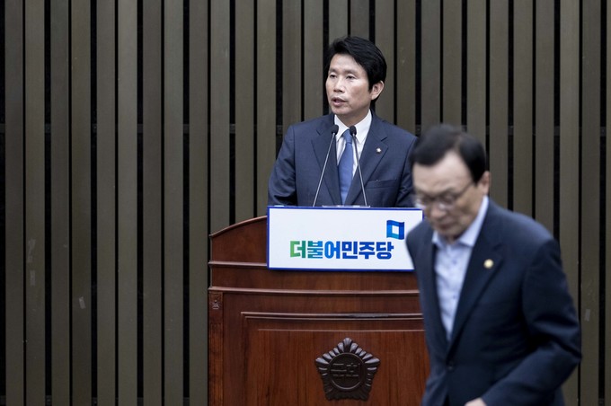 더불어민주당 이인영 원내대표가 2일 오후 서울 여의도 국회에서 열린 민주당 의원총회에 참석해 발언하고 있다.