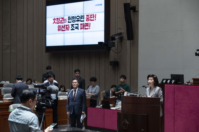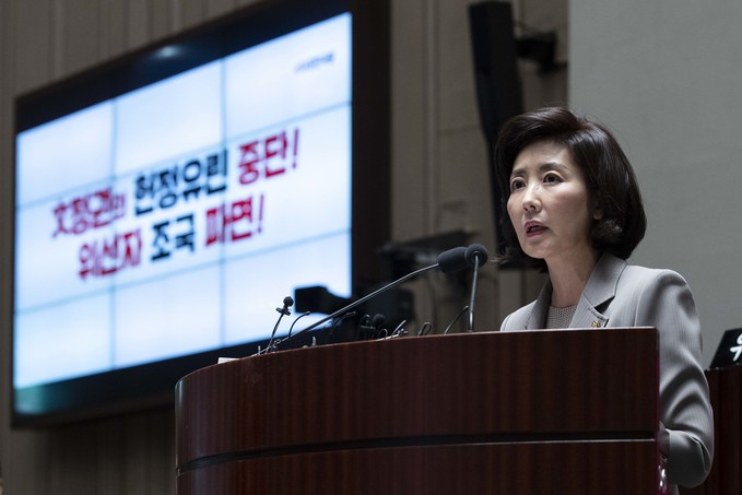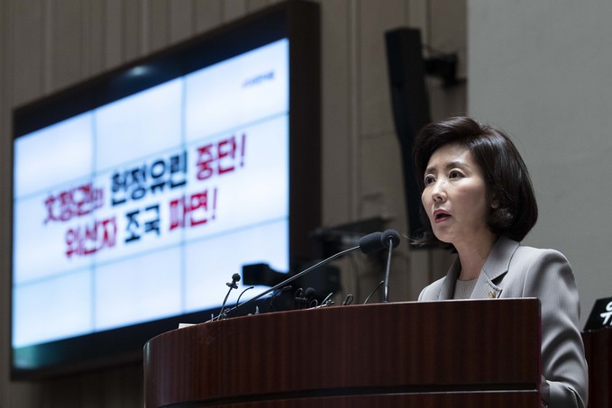자유한국당 나경원 원내대표가 26일 오전 서울 여의도 국회에서 열린 한국당 의원총회에 참석해 발언하고 있다.