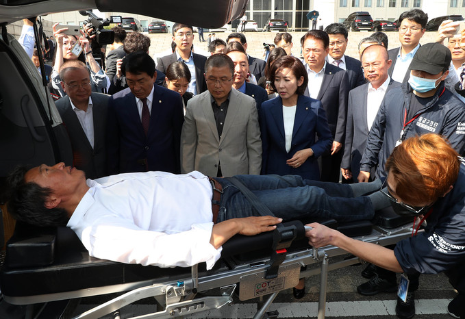 30일 오후 서울 여의도 국회 본관 앞에서 '조국 법무부 장관 사퇴, 문재인 대통령의 사과를 요구'하며 16일째 단식농성을 이어가고 있는 한국당 이학재 의원이 건강 상태 등을 확인하기 위해 병원으로 이송되고 있다.