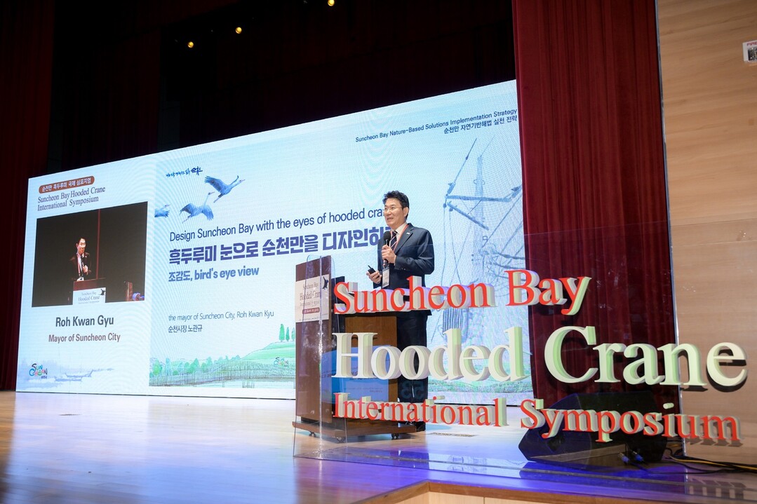 | ▲ 노관규 순천시장이 지난 5일 '2025 순천만 흑두루미 국제 심포지엄'에서 기조강연을 하고 있다. [순천시 제공] |
