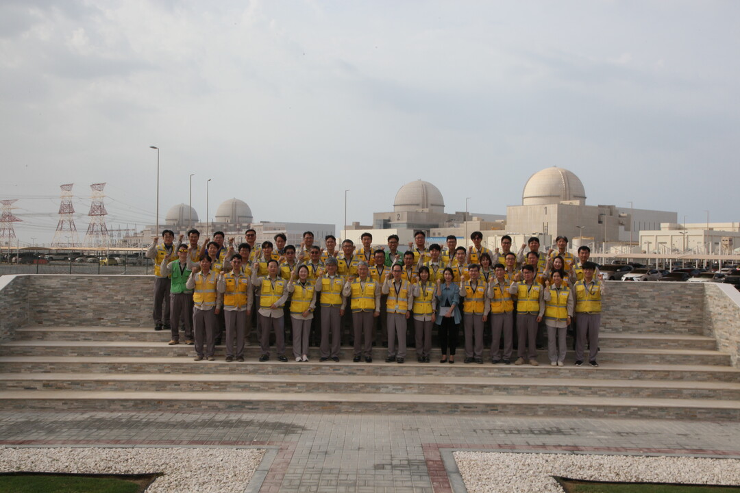 | ▲지난 16일 한국전력 김동철 사장이 UAE 바라카 원전을 찾아 점검에 나선 뒤 현장근무자들과 기념촬영을 하고 있다. [한국전력 제공] |