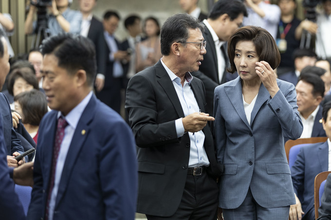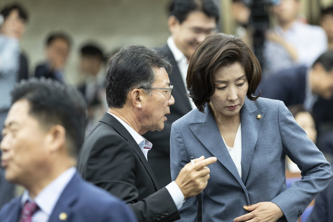 자유한국당 나경원 원내대표(오른쪽)가 9일 오후 서울 여의도 국회에서 열린 한국당 의원총회에 참석하고 있다.