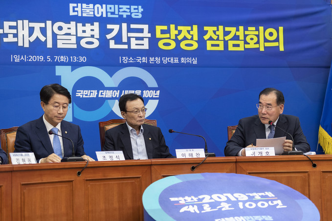 조정식 더불어민주당 정책위의장(왼쪽)이 7일 오후 서울 여의도 국회에서 열린 '아프리카돼지열병 긴급 당정 점검회의'에 참석해 발언하고 있다.