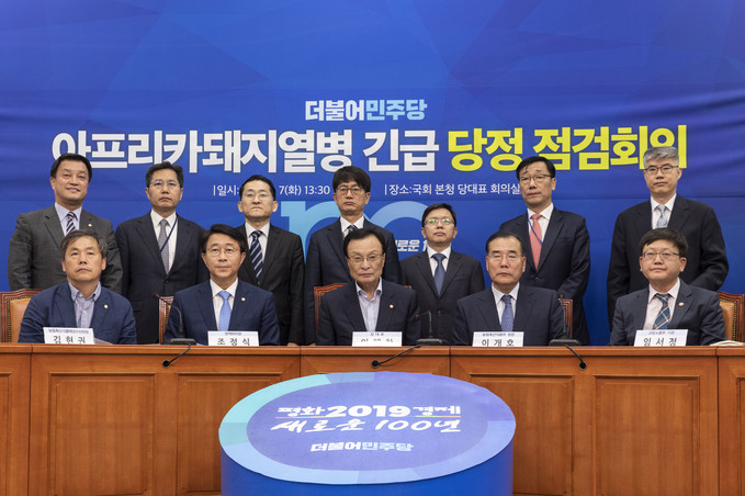 이해찬 더불어민주당 대표, 조정식 정책위의장, 이개호 농림축산식품부 장관 등 관계자들이 7일 오후 서울 여의도 국회에서 열린 '아프리카돼지열병 긴급 당정 점검회의'에서 기념촬영하고 있다.