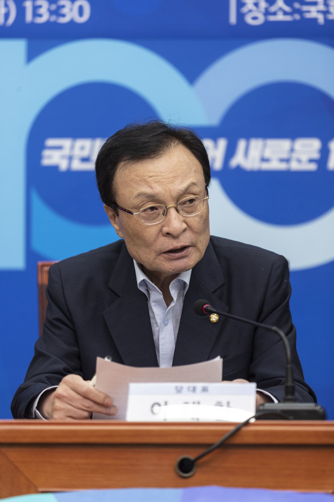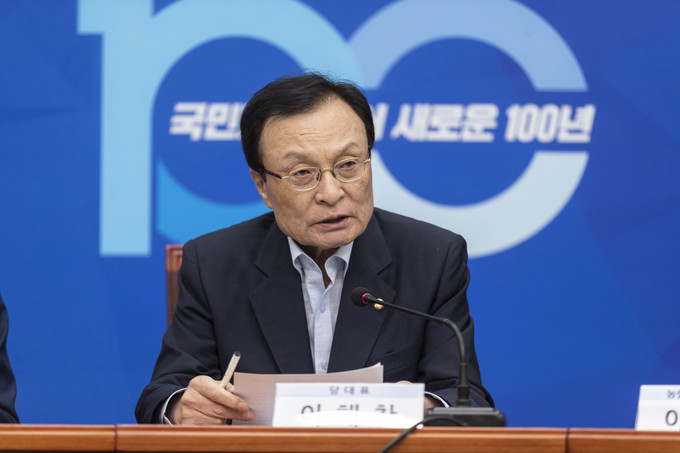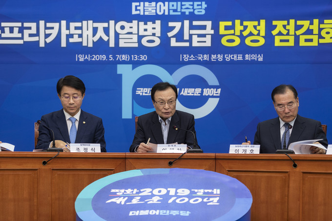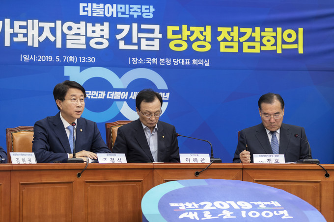 이해찬 더불어민주당 대표(가운데)가 7일 오후 서울 여의도 국회에서 열린 '아프리카돼지열병 긴급 당정 점검회의'에 참석해 발언하고 있다.