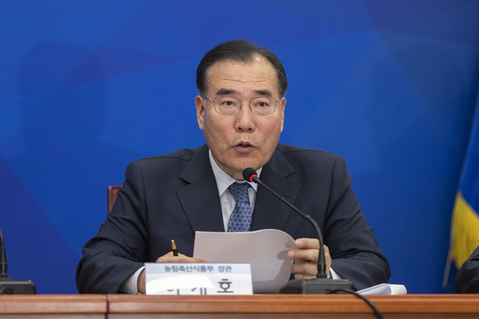 이개호 농림축산식품부 장관(오른쪽)이 7일 오후 서울 여의도 국회에서 열린 '아프리카돼지열병 긴급 당정 점검회의'에 참석해 발언하고 있다.