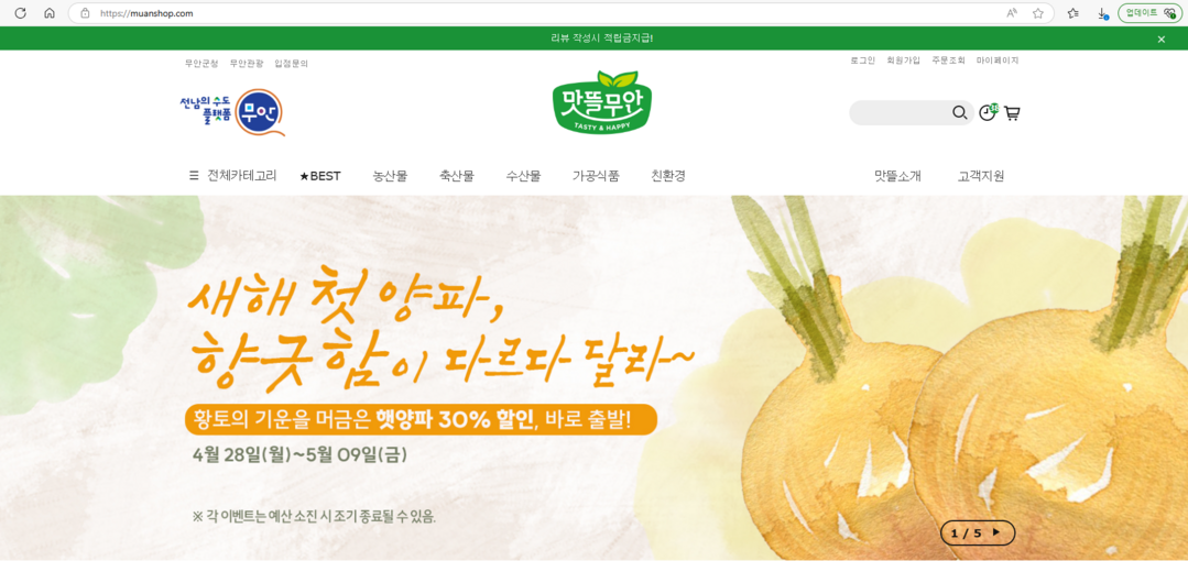 농특산물 온라인 쇼핑몰 '맛뜰무안몰'은 오는 28일부터 5월 9일까지 '햇양파 할인전'을 통해 1인당 2매의 할인 쿠폰을 제공한다.