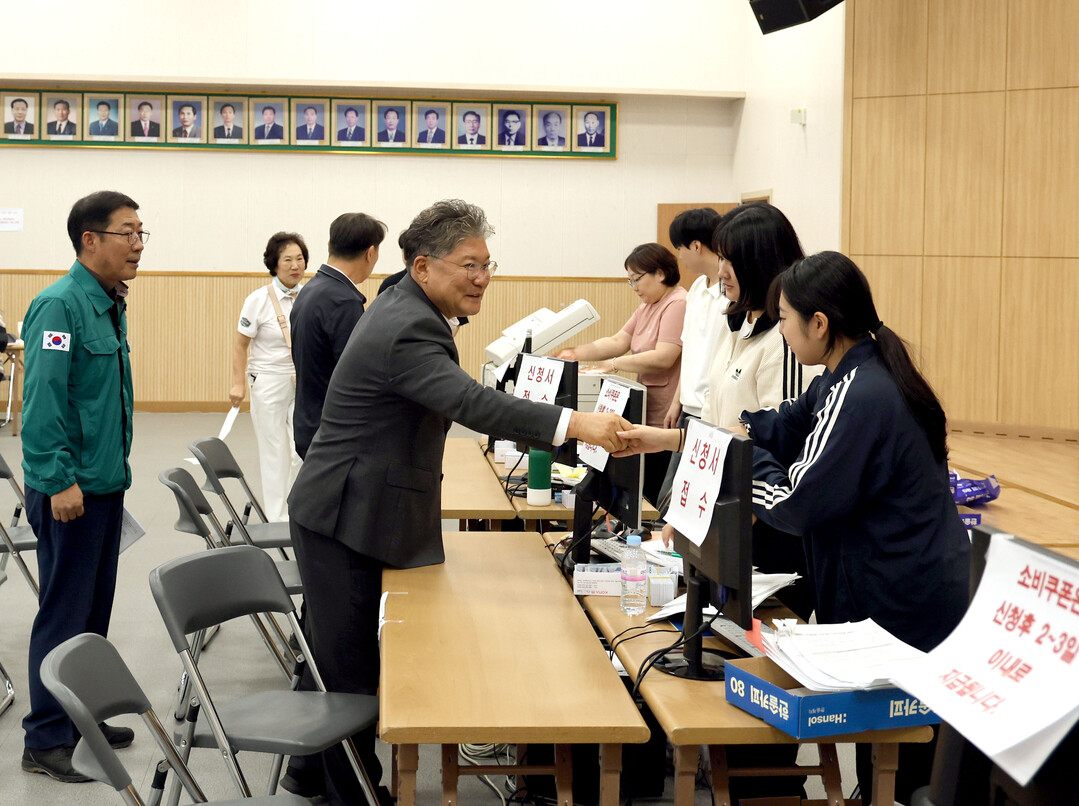 | ▲ 지난 22일 장세일 전남 영광군수가 민생회복 소비쿠폰 신청 진행이 한창 이뤄지고 있는 영광읍사무소를 찾아 현장점검과 소비쿠폰 지급업무에 힘쓰는 관계자 등을 격려하며 소통에 나서고 있다. [영광군 제공] |