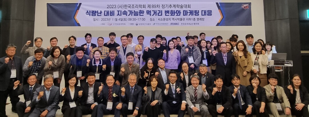 | ▲ 한국농수산식품유통공사(aT) 김춘진 사장이 지난 4일 서울 서소문성지역사박물관에서 열린 (사)한국조리학회 정기추계학술대회에 참석해 ‘식량위기 대응 지속가능한 먹거리’를 주제로 기조강연을 펼친 뒤 기념촬영을 하고 있다. [aT제공] |