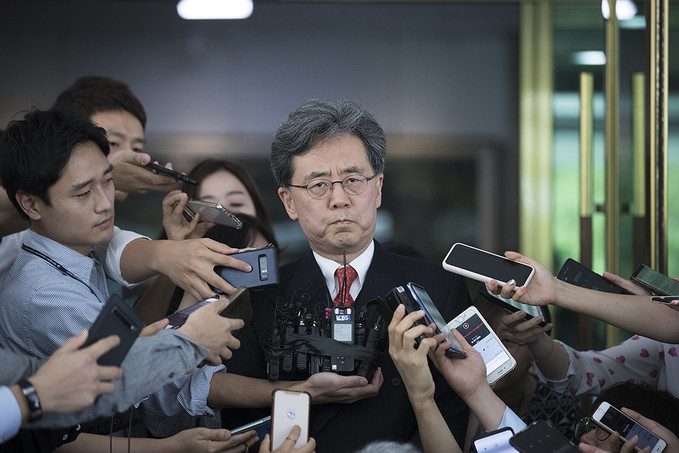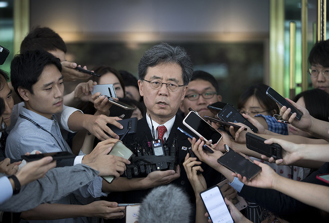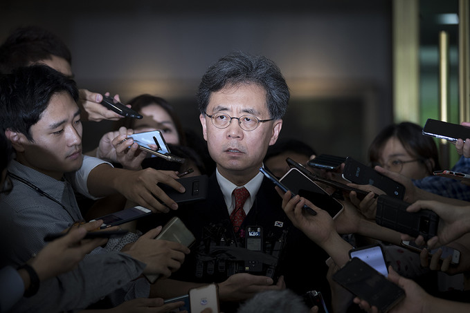 김현종 청와대 국가안보실 2차장이 22일 오후 서울 종로구 정부서울청사에서 스티븐 비건 미 국무부 대북정책득별대표와 회동을 마친 뒤 취재진의 질문에 답하고 있다.