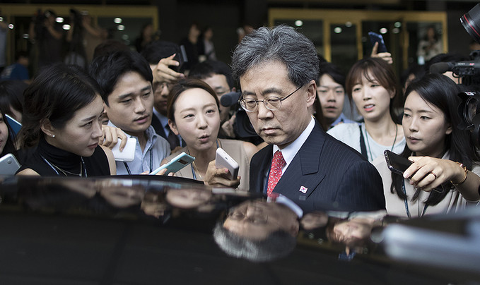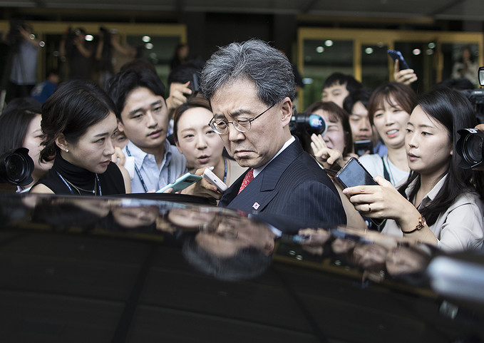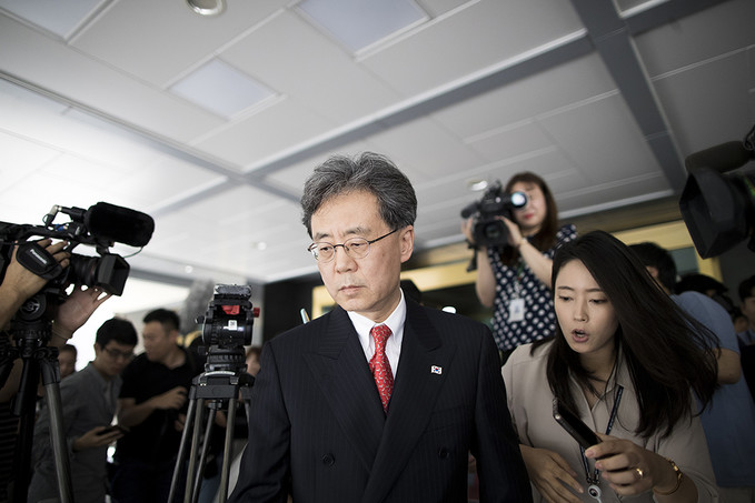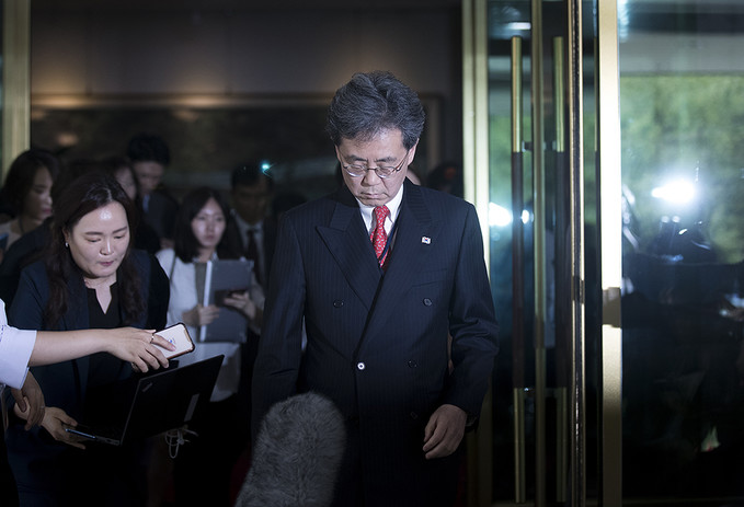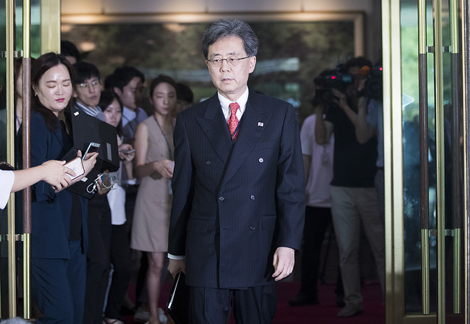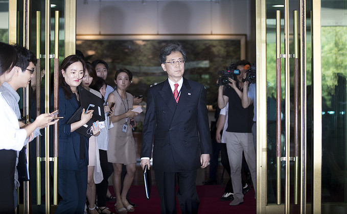 김현종 청와대 국가안보실 2차장이 22일 오후 서울 종로구 정부서울청사에서 스티븐 비건 미 국무부 대북정책특별대표와 회동을 마친 뒤 차량에 탑승하고 있다.