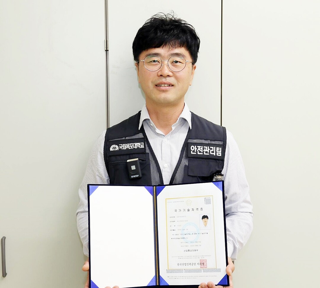 | ▲ 국립목포대학교 총무과 안전관리팀 이상선 주무관이 기능장 시험에 합격한 뒤 자격증을 들고 있다. [목포대 제공] |