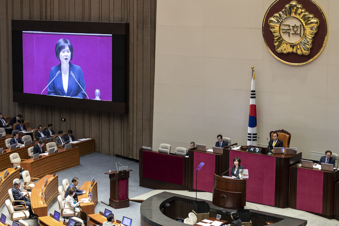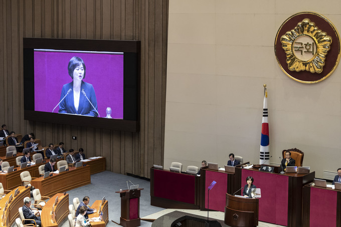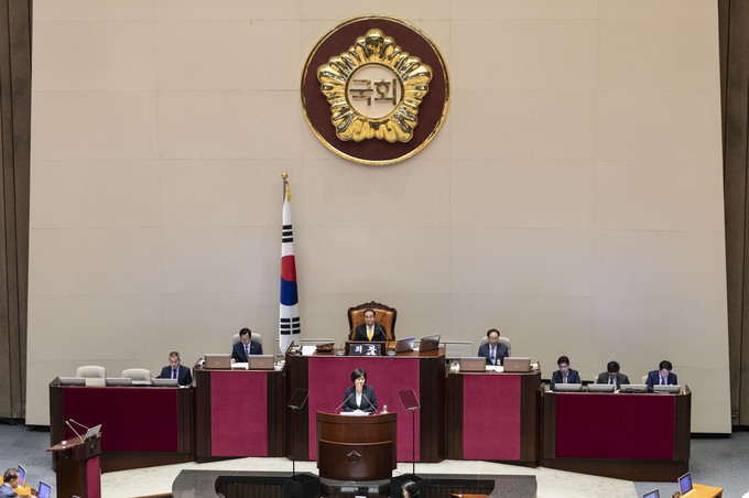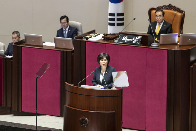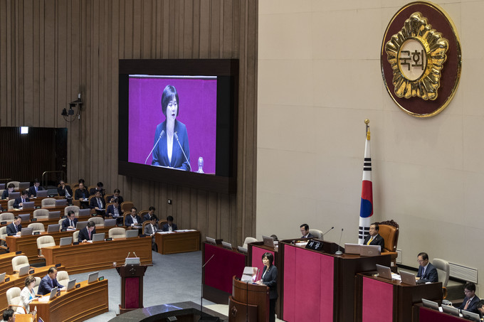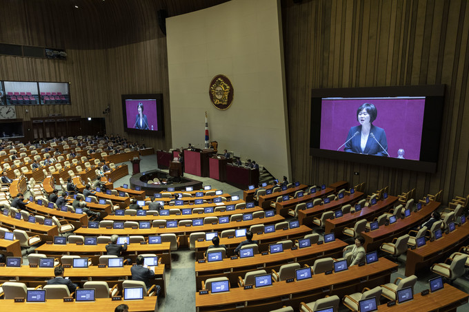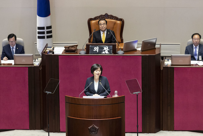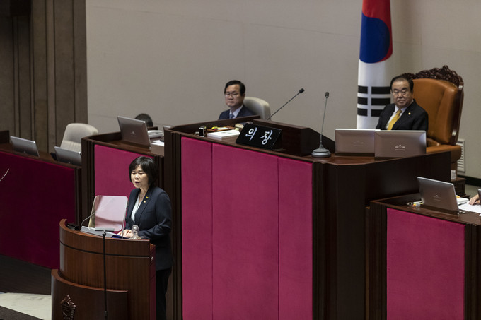 정의당 이정미 대표가 10일 오후 서울 여의도 국회에서 열린 제369회 국회(임시회) 제7차 본회의에서 비교섭단체 대표 연설을 하고 있다.