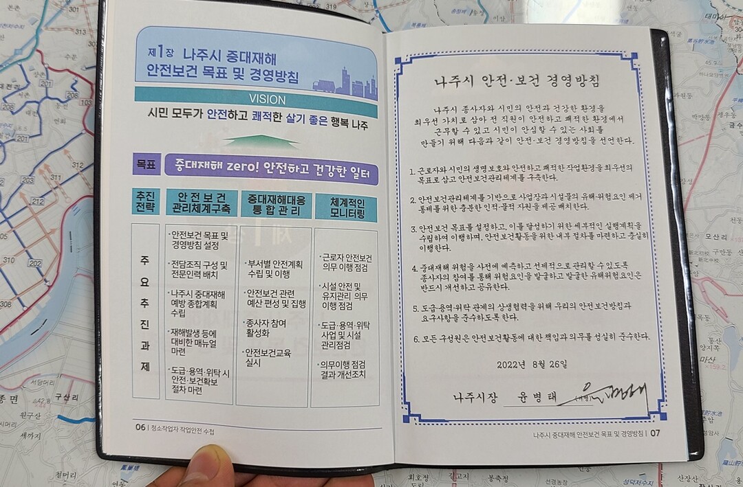 또 나주시 중대재해 안전보건 목표와 경영방침, 중대재해 대응 체계도와 지난 1월 27일 시행된 ‘중대재해처벌법’, 비상연락망, 환경미화원 대기실 현황도 실렸다.
