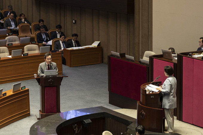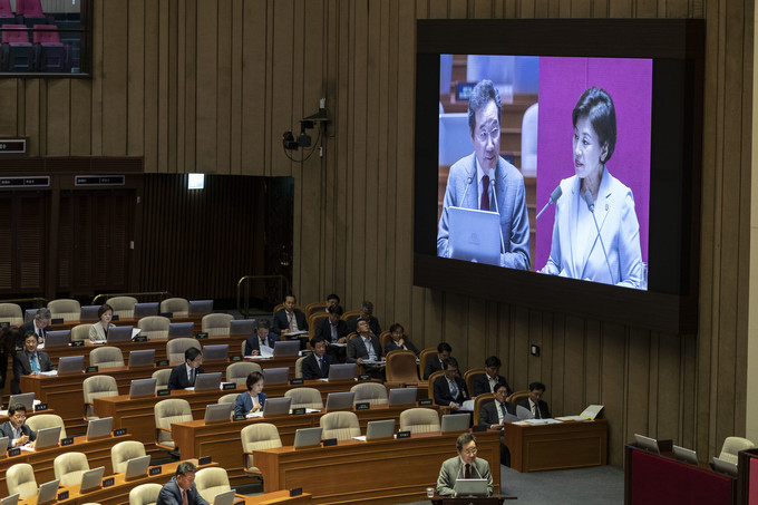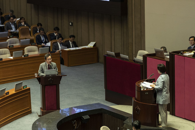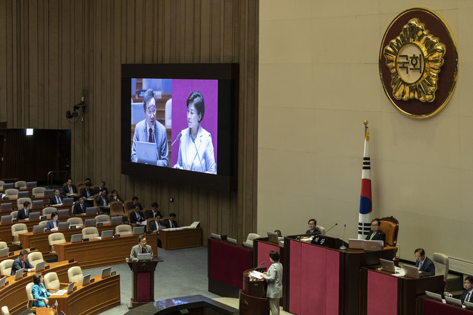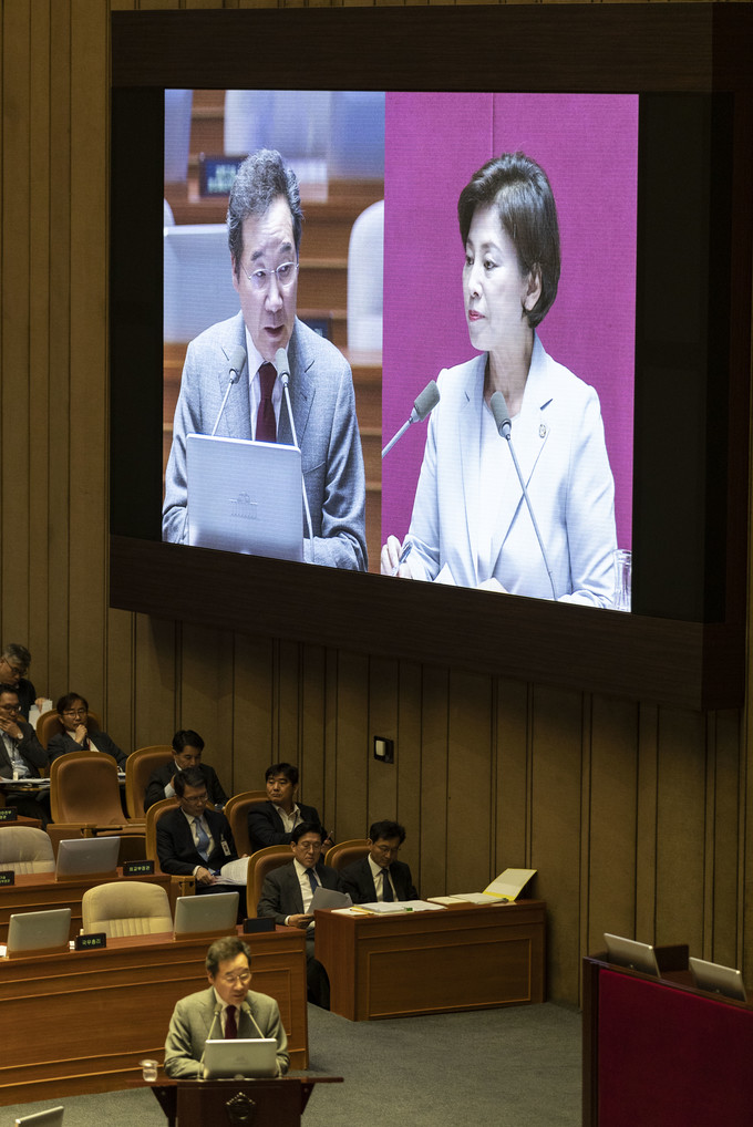이낙연 국무총리(왼쪽)가 11일 오후 서울 여의도 국회에서 열린 본회의 대정부 질문에 출석해 더불어민주당 남인순 의원 질의에 답하고 있다.