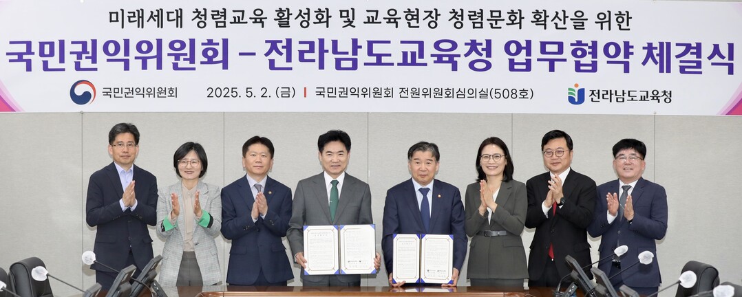 두 기관은 국민권익위 세종청사에서 '미래세대 청렴교육과 청렴 문화 확산을 위한 업무협약'을 체결하고, 청렴교육 관련 제도 개선과 실천 방안 공동 추진에 합의했다.