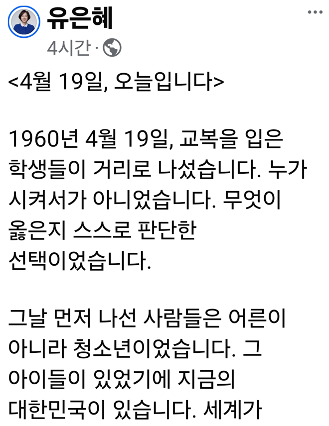 유 예비후보는 "1960년 4월 19일, 교복을 입은 학생들이 거리로 나섰다"며 "누가 시켜서가 아니라 무엇이 옳은지 스스로 판단한 선택이었다"고 강조했다.