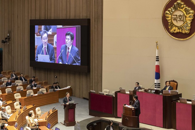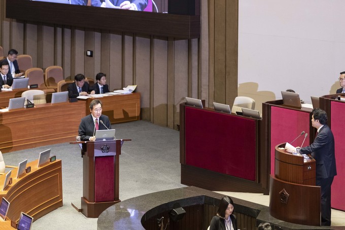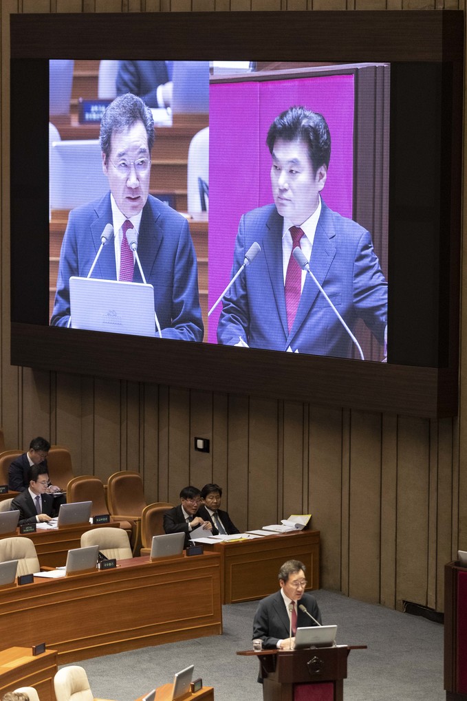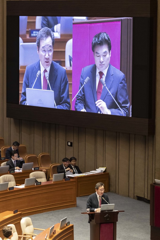 이낙연 국무총리(왼쪽)가 27일 오후 서울 여의도 국회에서 열린 제371회 국회(정기회)제3차 본회의 대정부질문(외교·통일·안보에 관한 질문)에 출석해 한국당 원유철 의원 질의에 답하고 있다.