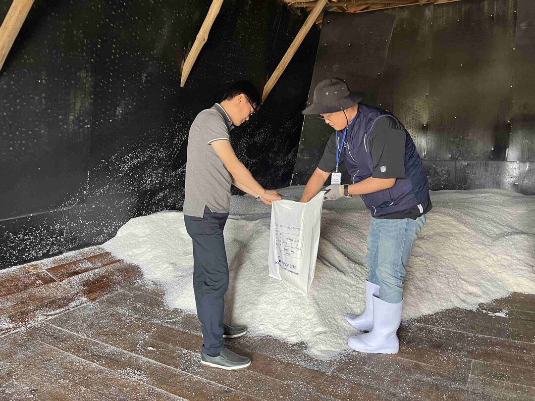 | ▲ 영광군이 지난 13일 민간전문기관과 함께 허가된 염전 78개소를 방문해 천일염 방사능 검사를 위한 시료를 채취하고 있다. [영광군 제공] |