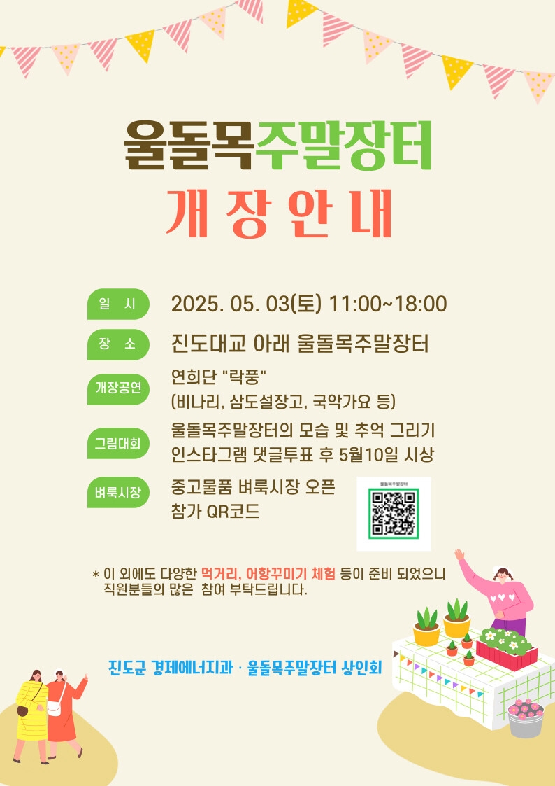 진도군은 "울돌목 주말장터가 지역민과 관광객이 함께 어우러지는 명소로 자리 잡길 기대하며 많은 관심과 참여를 바란다"고 밝혔다.