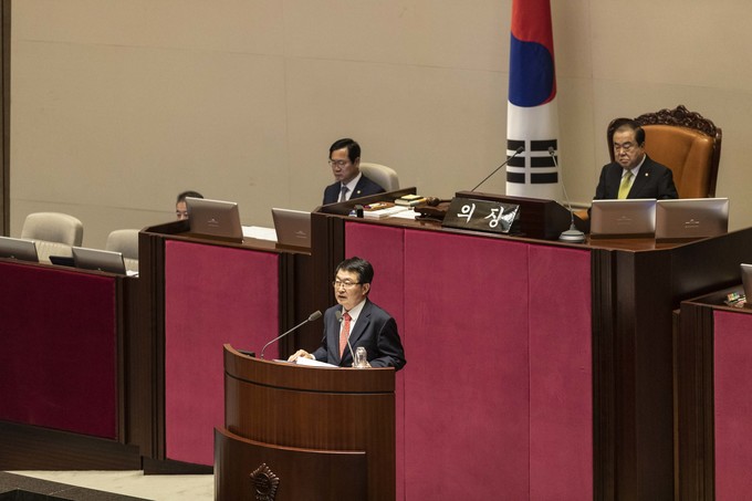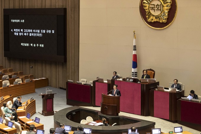 자유한국당 소속 국방위 백승주 위원이 30일 오후 서울 여의도 국회에서 열린 제371회 국회(정기회) 제4차 본회의에 참석해 '북한의 핵 고도화와 미사일 도발 규탄 및 재발 방지 촉구 결의안 '에 대해 제안 설명을 하고 있다.