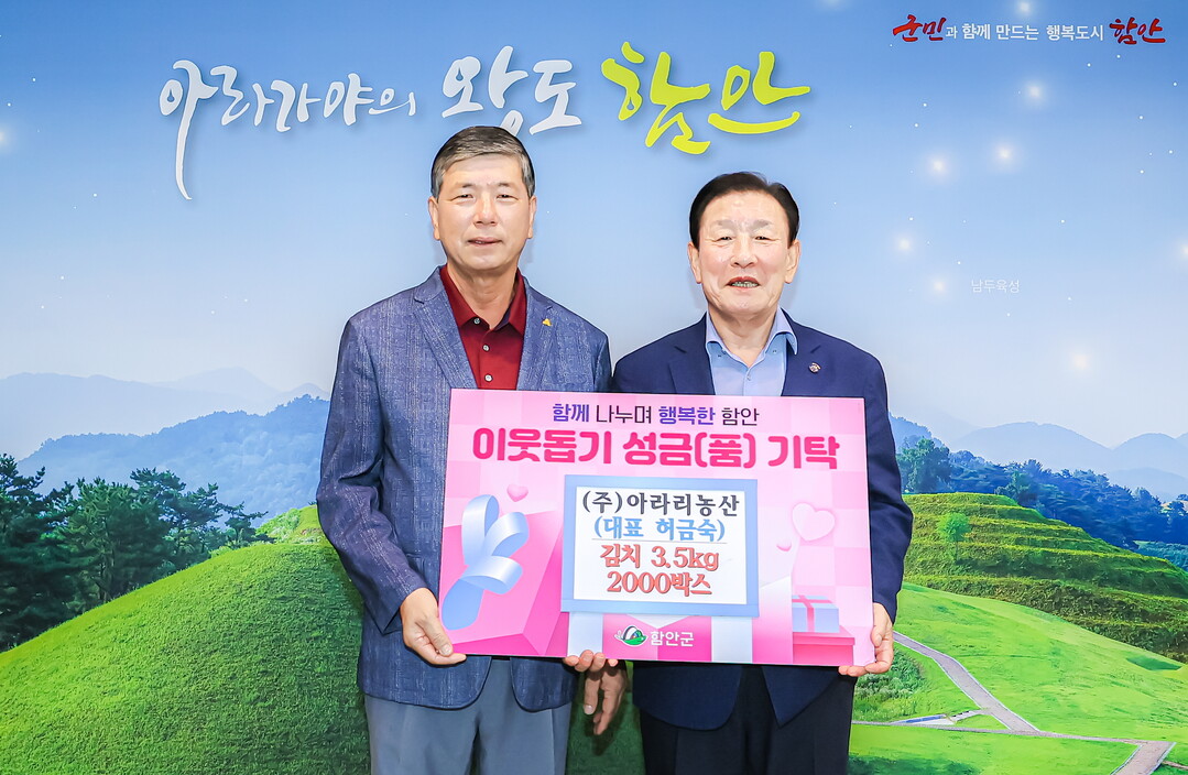 경남 함안군은 23일 ㈜아라리농산(대표 허금숙)에서 지역의 소외된 이웃들을 위해 정성껏 담근 김치 3.5㎏들이 2000박스(7000㎏·4000만 원 상당)을 기탁했다고 밝혔다.