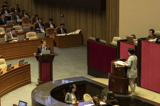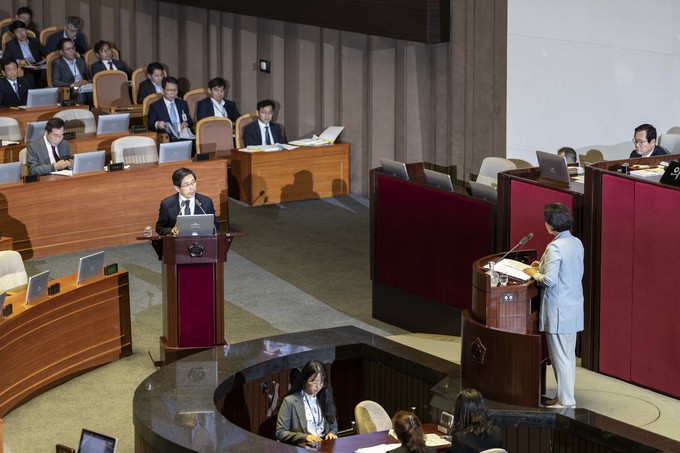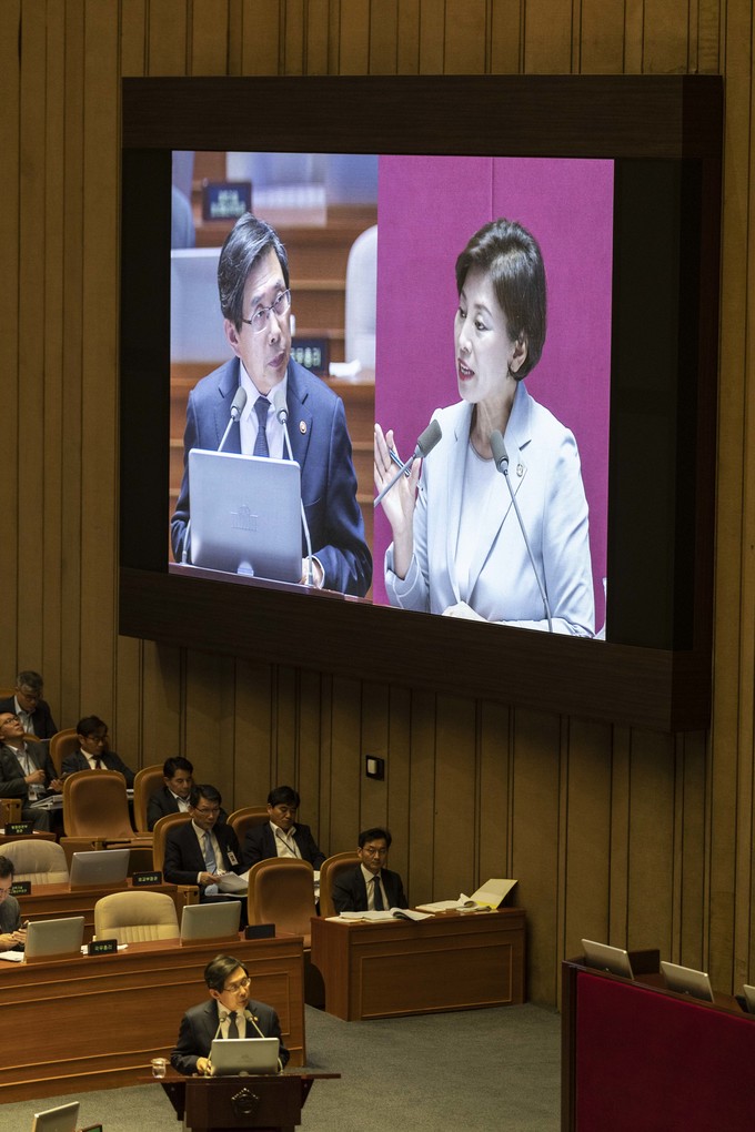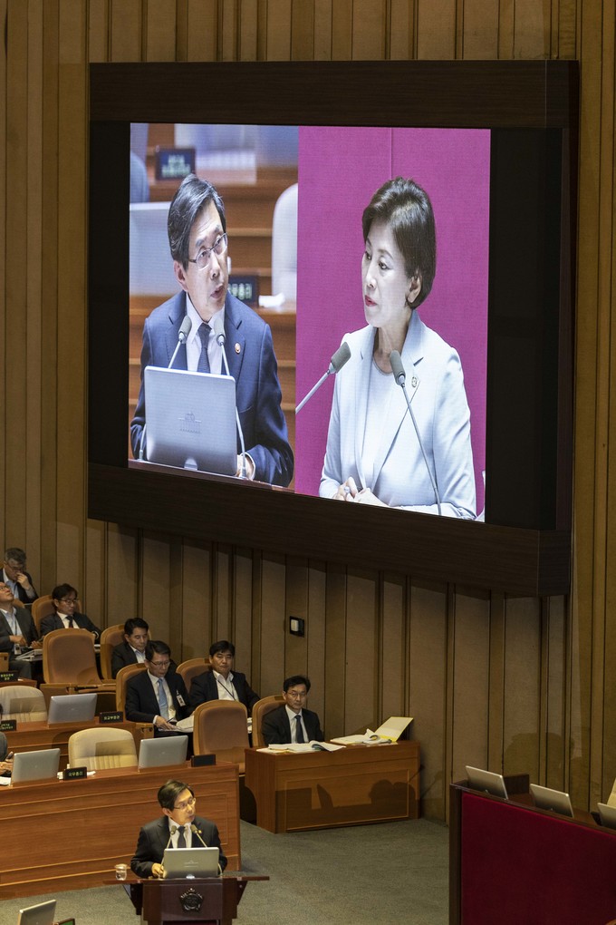 박상기 법무부 장관(왼쪽)이 11일 오후 서울 여의도 국회에서 열린 본회의 대정부 질문에 출석해 더불어민주당 남인순 의원 질의에 답하고 있다.