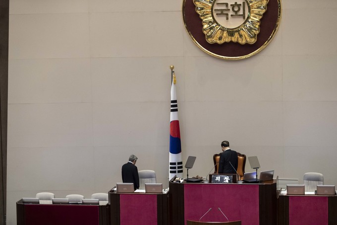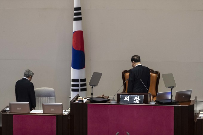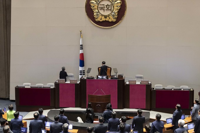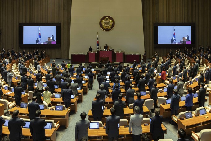 문희상 국회의장과 의원들이 2일 오후 서울 여의도 국회에서 열린 제371회(정기회) 개회식에 참석해 국민의례를 하고 있다.
