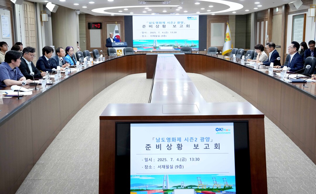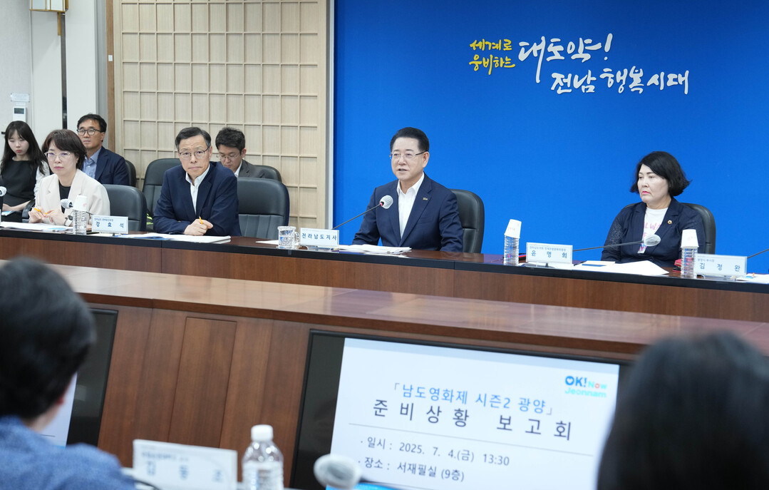 | ▲ 김영록 전라남도지사가 4일 오후 서재필실에서 '남도영화제 시즌2 광양' 준비상황 보고회를 주재하고 분야별 준비상황 등 주요 내용에 대해 논의하고 있다. '남도영화제 시즌2 광양'은 '광양, 빛과 철로 물들다!'란 주제로 오는 10월23일 부터 나흘동안 광양 일원 5개소에서 영화 65편을 상영한다. [전남도 제공] |