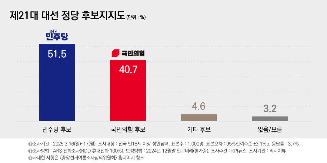 KPI뉴스가 리서치뷰에 의뢰해 지난 16, 17일 전국 만 18세 이상 1000명을 대상으로 여론조사를 실시한 결과 '내일이 대통령 선거일이라면 어느 정당 후보를 지지하겠냐'는 질문에 응답자의 51.5%가 민주당 후보라고 밝혔다. 40.7%는 국민의힘 후보를 선택했다.