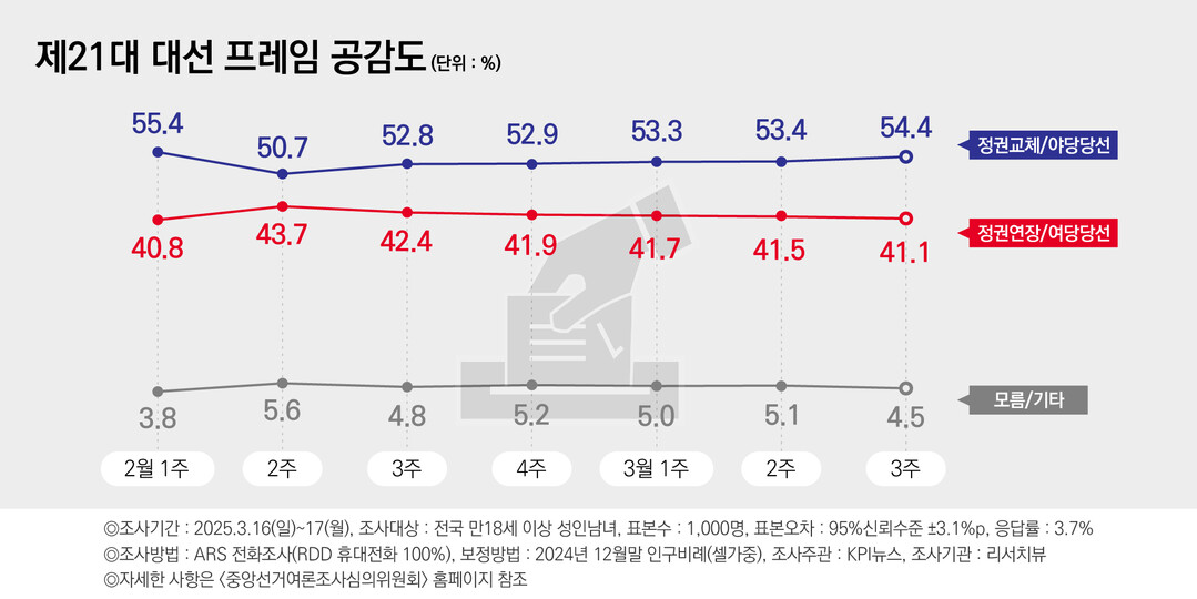 대선 프레임…정권 교체 54.4%, 정권 연장 41.1%