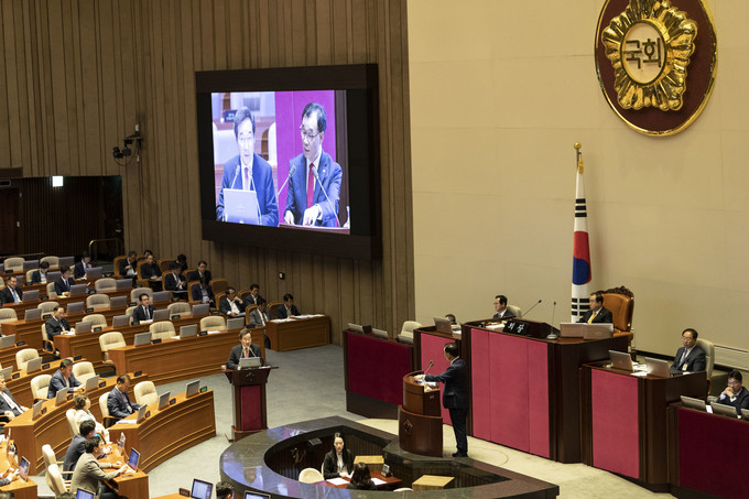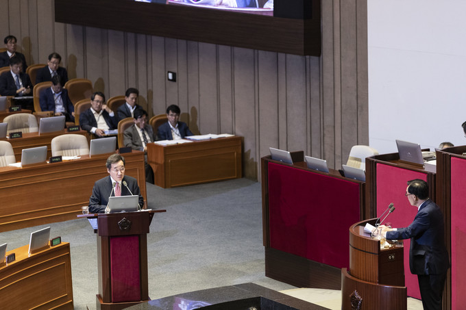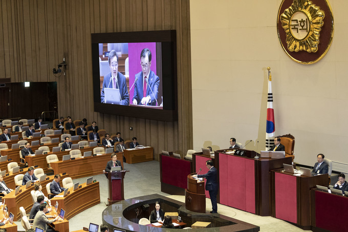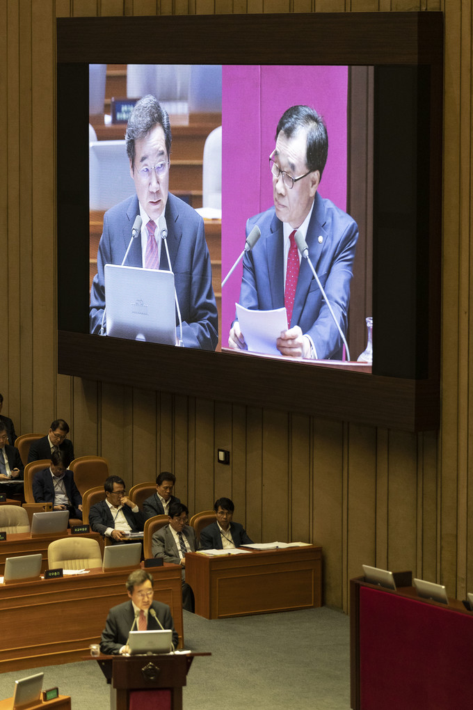 이낙연 국무총리(왼쪽)가 10일 오후 서울 여의도 국회에서 열린 본회의 대정부 질문에 출석해 자유한국당 김기선 의원 질의에 답하고 있다.