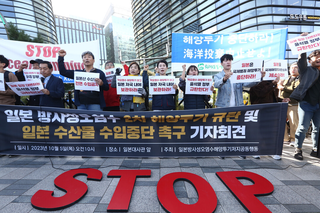 일본의 후쿠시마 오염수 2차 방류를 앞두고 일본방사성오염수해양투기저지공동행동이 5일 오전 서울 종로구 주한일본대사관 앞에서 규탄 기자회견을 열었다.