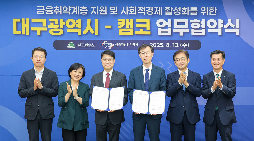 캠코(KAMCO·한국자산관리공사)는 13일 대구시와 취약계층 지원 및 사회적 경제 활성화를 위한 업무협약(MOU)을 체결했다고 밝혔다.
