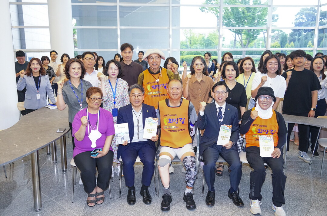 | ▲ 강기정 광주광역시장이 8일 오전 시청 1층 열린문화공간에서 '2025 경주 APEC(아시아태평양경제협력체) 성공 개최'를 기원하며 왼발 도보 종주에 나선 이범식(60·경북 경산)씨를 격려한 뒤 기념촬영을 하고 있다. 이씨는 8일 광주광역시청에서 출발해 오는 27일까지 21일간 경주까지 400km를 걸으며 APEC 성공개최를 기원하고 동서 지역간 화합의 메시지를 전달한다. [광주광역시 제공] |