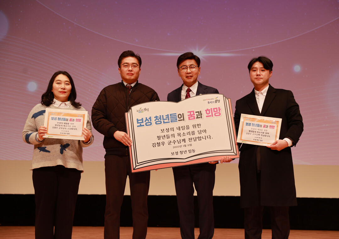 | ▲ 11일 김철우 전남 보성군수가 문화예술회관에서 열린 '2025년 군민과의 대화 보성읍 편'에서 청년들이 건넨 35가지 제안사항을 받은 뒤 기념촬영을 하고 있다. [보성군 제공] |