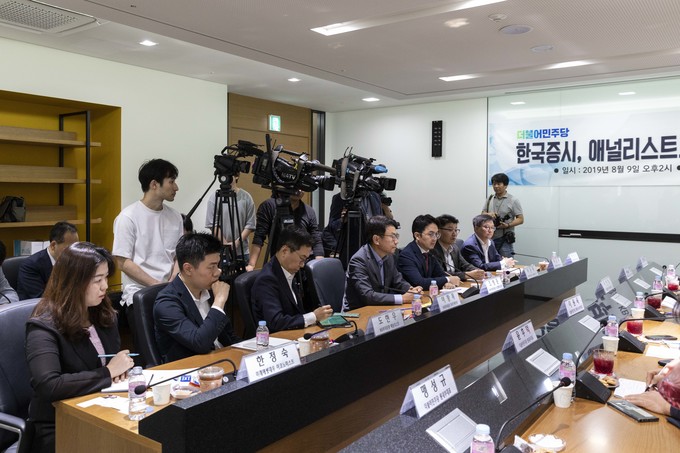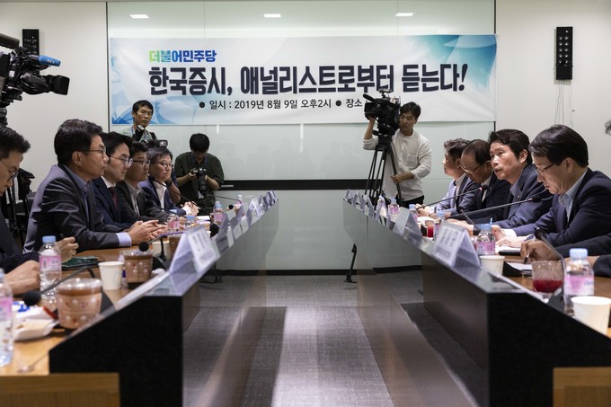 더불어민주당 '한국증시, 애널리스트로부터 듣는다' 간담회가 9일 오후 서울 여의도 KB증권에서 열린 가운데 참석자들이 이인영 원내대표 발언을 듣고 있다. 왼쪽부터 한정숙 미래에셋대우 이코노미스트, 도현우 NH투자증권 애널리스트, 이창목 NH투자증권 리서치센터장, 조병문 타이거투자자문 스트래티지스트, 이은택 KB투자증권 스트래티지스트, 이승우 유진투자증권 애널리스트, 이상재 유진투자증권 이코노미스트.