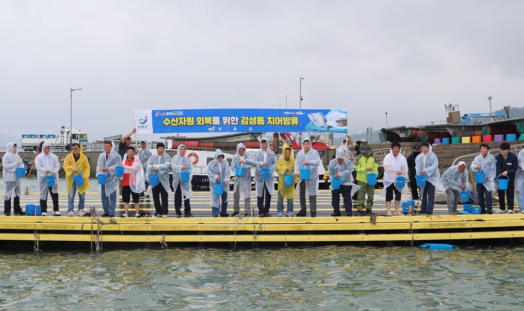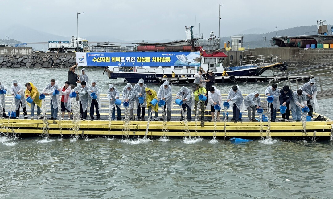| ▲ 전남 장흥군이 지난 16일 지역 어업인, 해양 관련 단체 등 40명과 함께 회진면 대리항에서 감성돔 치어 22만미를 방류하고 있다. [장흥군 제공] |