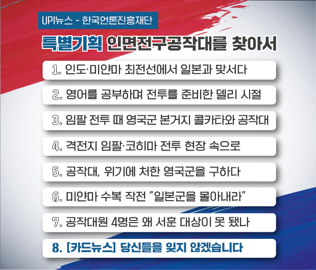 UPI뉴스는 한국언론진흥재단이 주관하는 2023년 언론진흥기금 기획취재 지원사업(3차)의 일환으로 지난 8월부터 이달 초까지 미얀마와 인도를 방문해 한국광복군 인면전구공작대에 대한 기획취재를 진행했다. 2차 세계대전 때 인도·미얀마 전선에서 인상적 활동을 벌였으나 지금은 기억하는 이가 드문 인면전구공작대의 잊힌 역사를 복원하는 작업이었다. 인면전구공작대 유적지 전반에 대한 한국 언론 최초의 현지 조사이기도 한 기획취재 결과물을 8회에 걸쳐 연재한다.