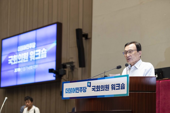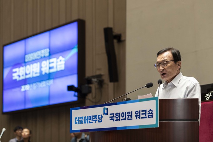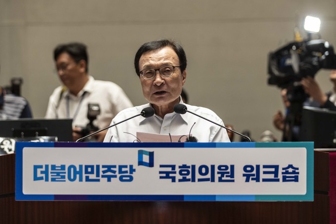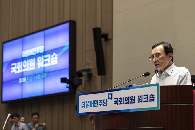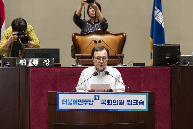 더불어민주당 이해찬 대표가 18일 오후 서울 여의도 국회 예결위회의장에서 열린 '더불어민주당 국회의원 워크숍'에 참석해 발언하고 있다.